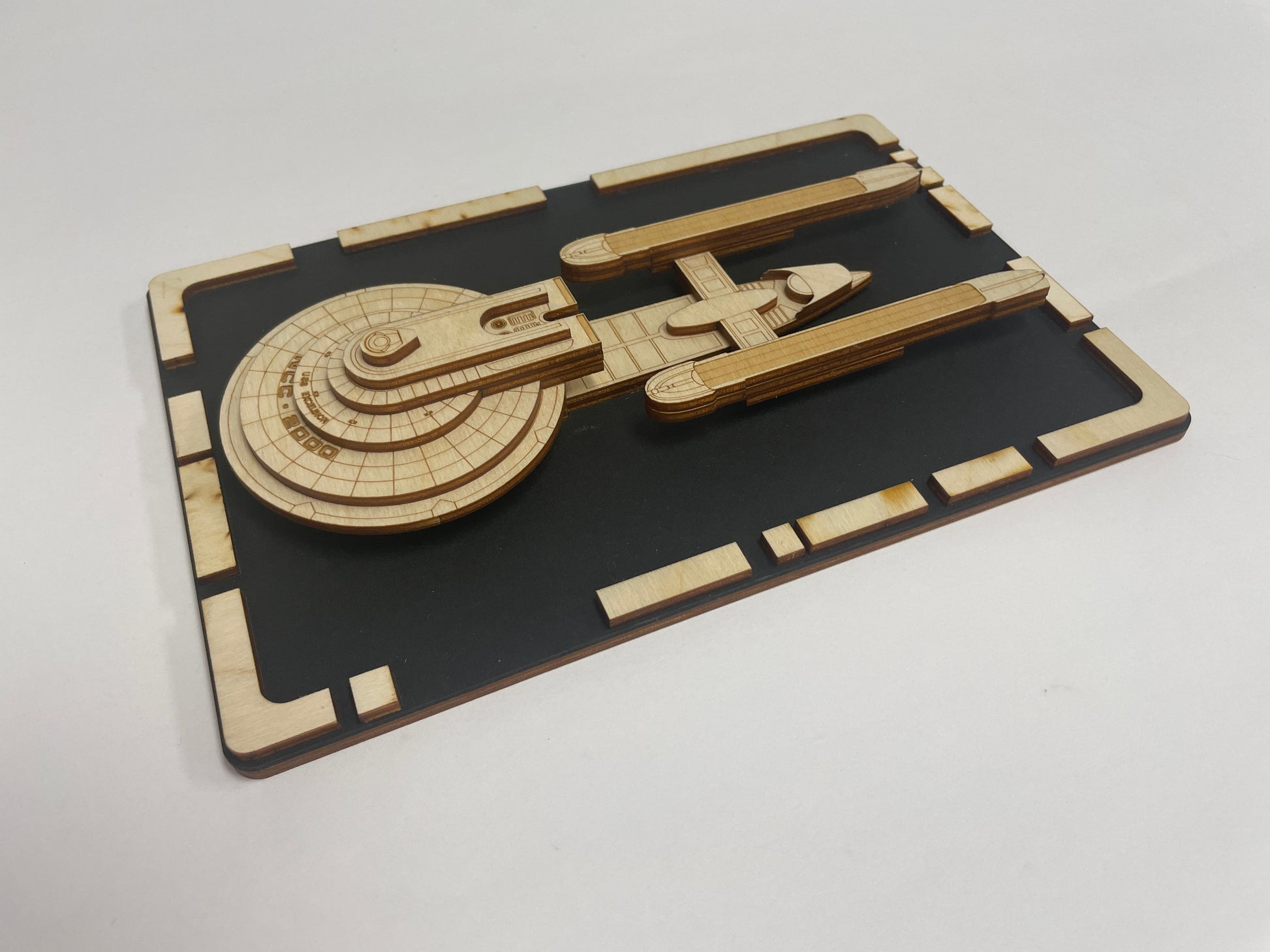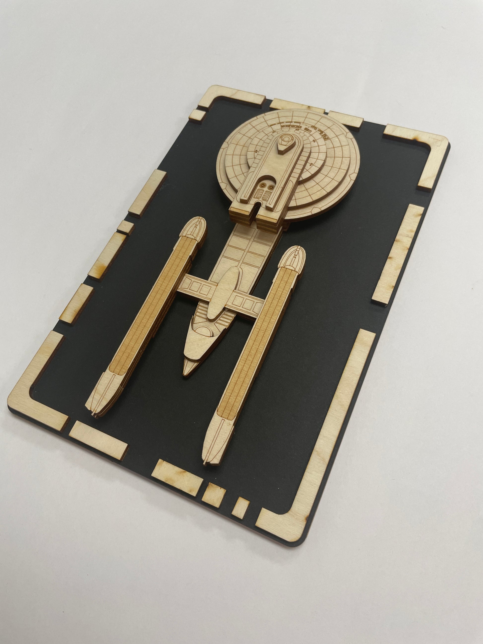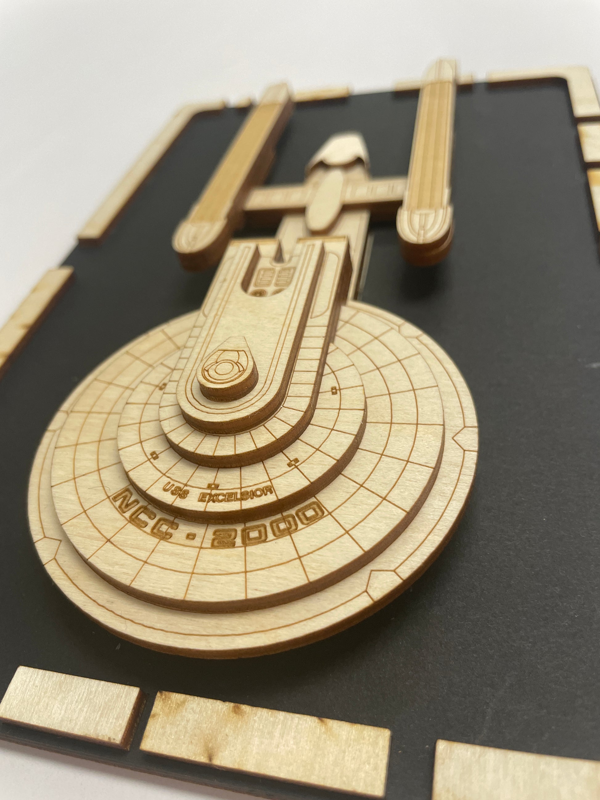 Wood pop art starship plaque of the USS EXCELSCIOR (EXCELSCIOR CLASS). Built from layers of durable plywood giving the model a three dimensional effect. A sheet of black museum board makes the starship’s details pop. An LCARS style border frames the models. Put it on your desk, display rack or bookshelf. A great display item for that Trekkie in your life.