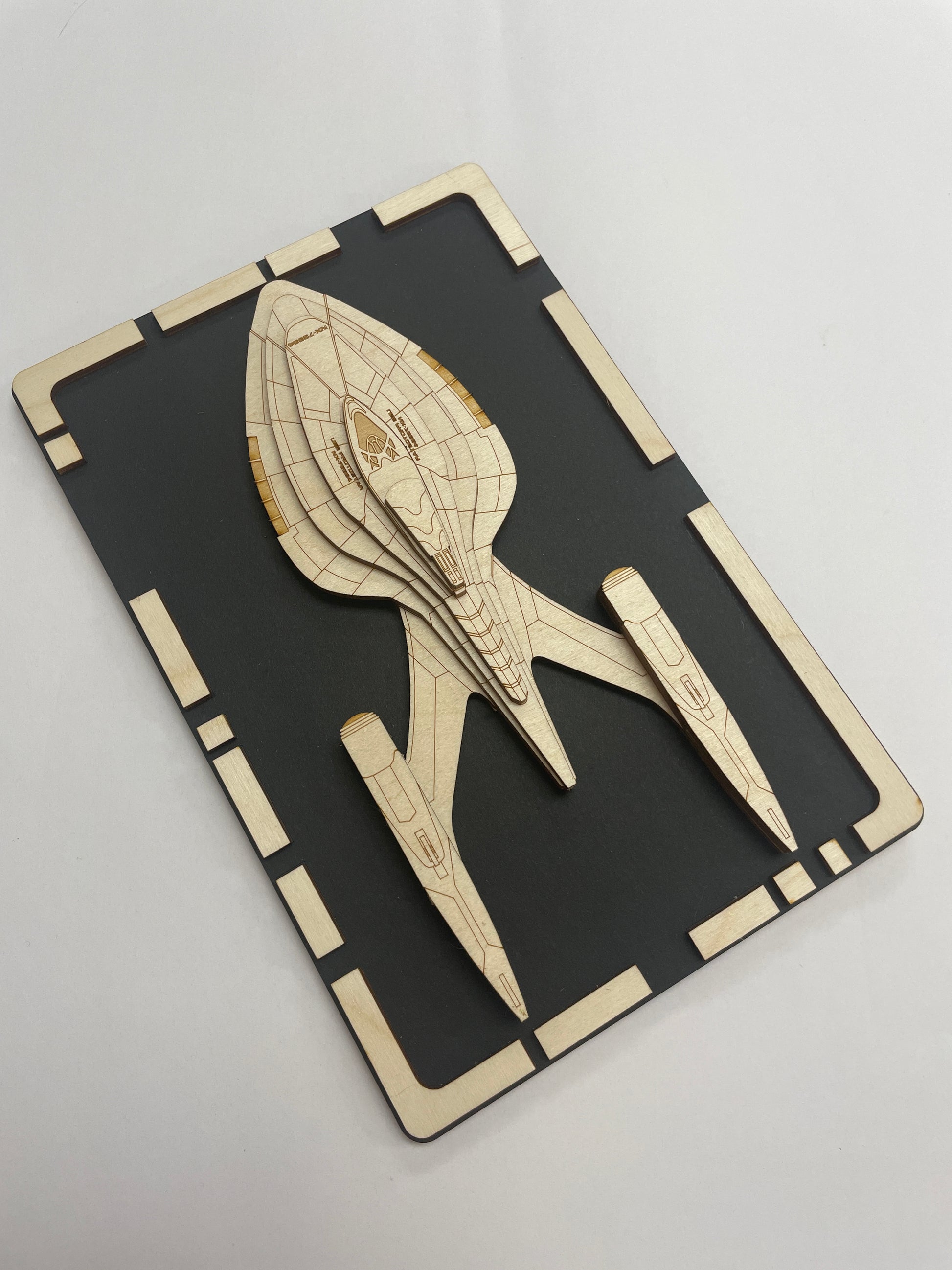 Wood pop art starship plaque of the USS PROTOSTAR (PROTOSTAR CLASS). Built from layers of durable plywood giving the model a three dimensional effect. A sheet of black museum board makes the starship’s details pop. An LCARS style border frames the models. Put it on your desk, display rack or bookshelf. A great display item for that Trekkie in your life.