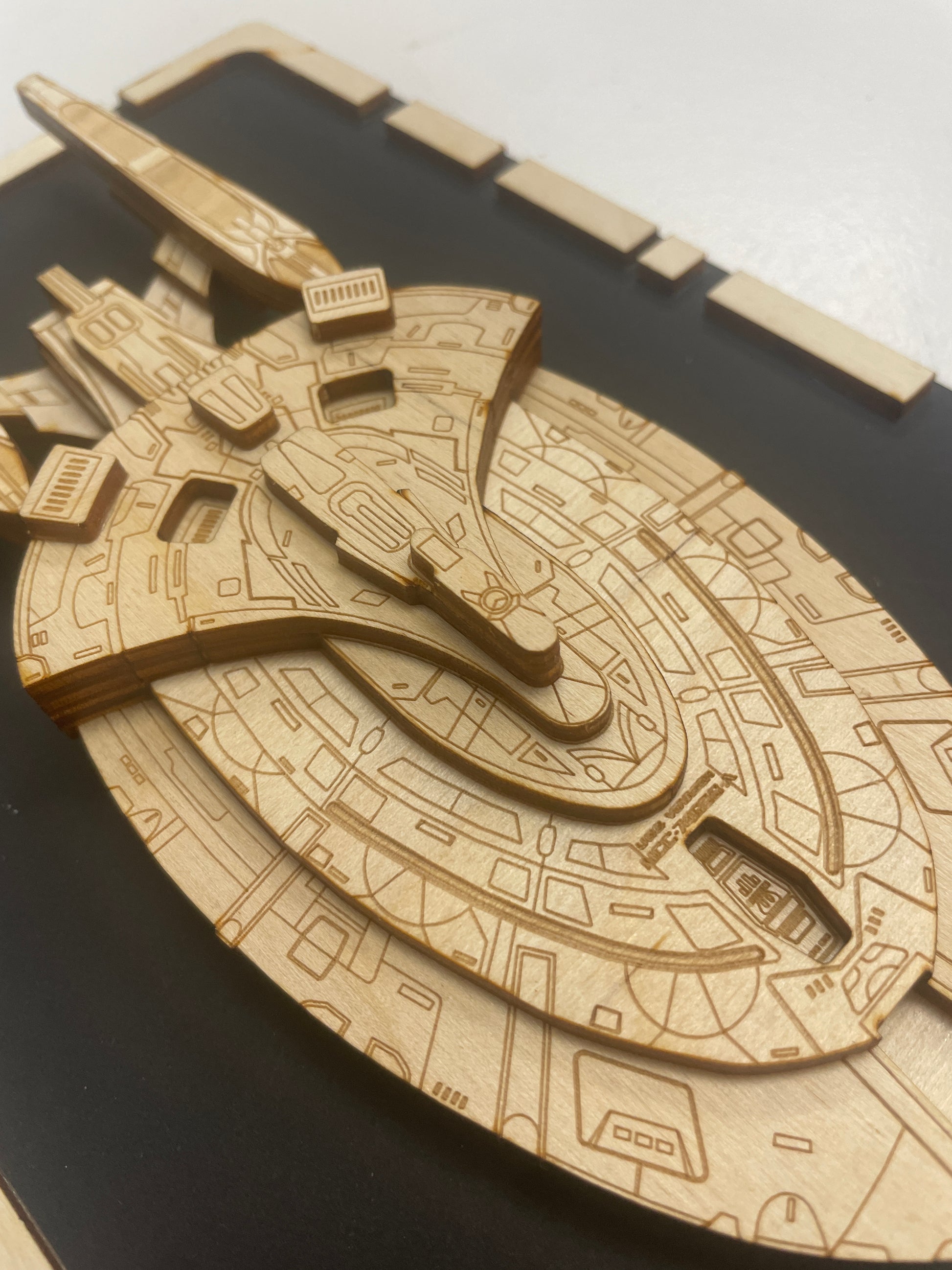 Wood pop art starship plaque of the USS VOYAGER-A (LaMARR CLASS). Built from layers of durable plywood giving the model a three dimensional effect. A sheet of black museum board makes the starship’s details pop. An LCARS style border frames the models. Put it on your desk, display rack or bookshelf. A great display item for that Trekkie in your life.