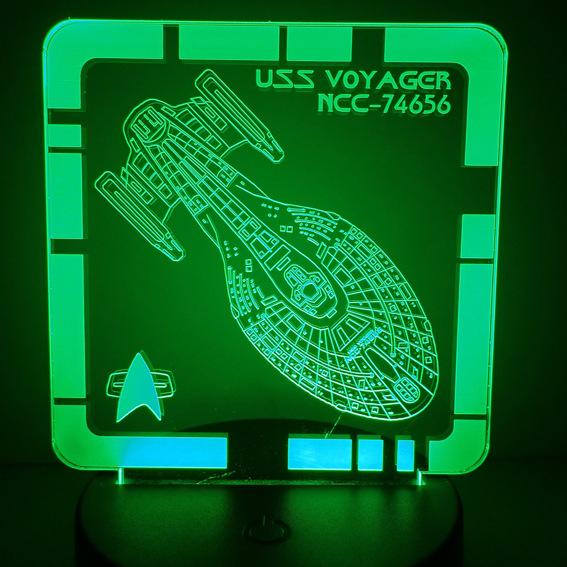 Etched acrylic starship plaque of the USS VOYAGER (INTREPID CLASS) with an LCARS style border. Each model comes with their own mutli-color changing LED light base. Colors include, Red, Yellow, Green, Blue, Magenta, Cyan, Orange and White. The base is either USB powered or battery powered (batteries not included). A great display item for that Trekkie in your life. Put it on your desk, display rack or bookshelf. It even can be used as a night light!