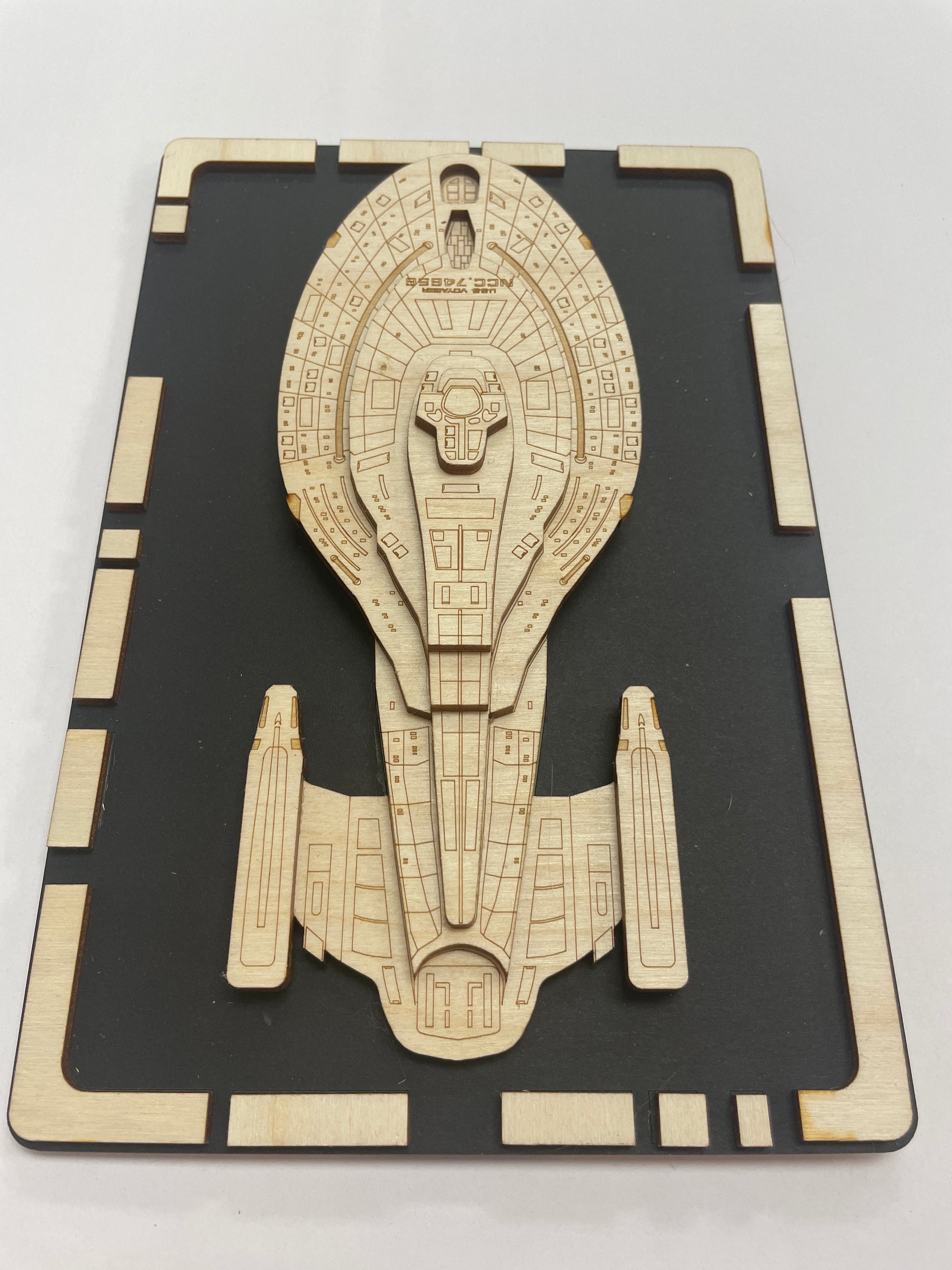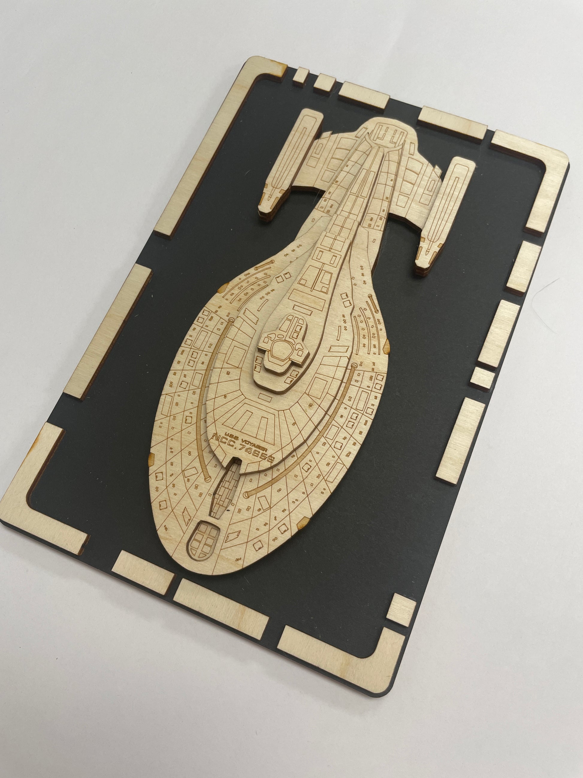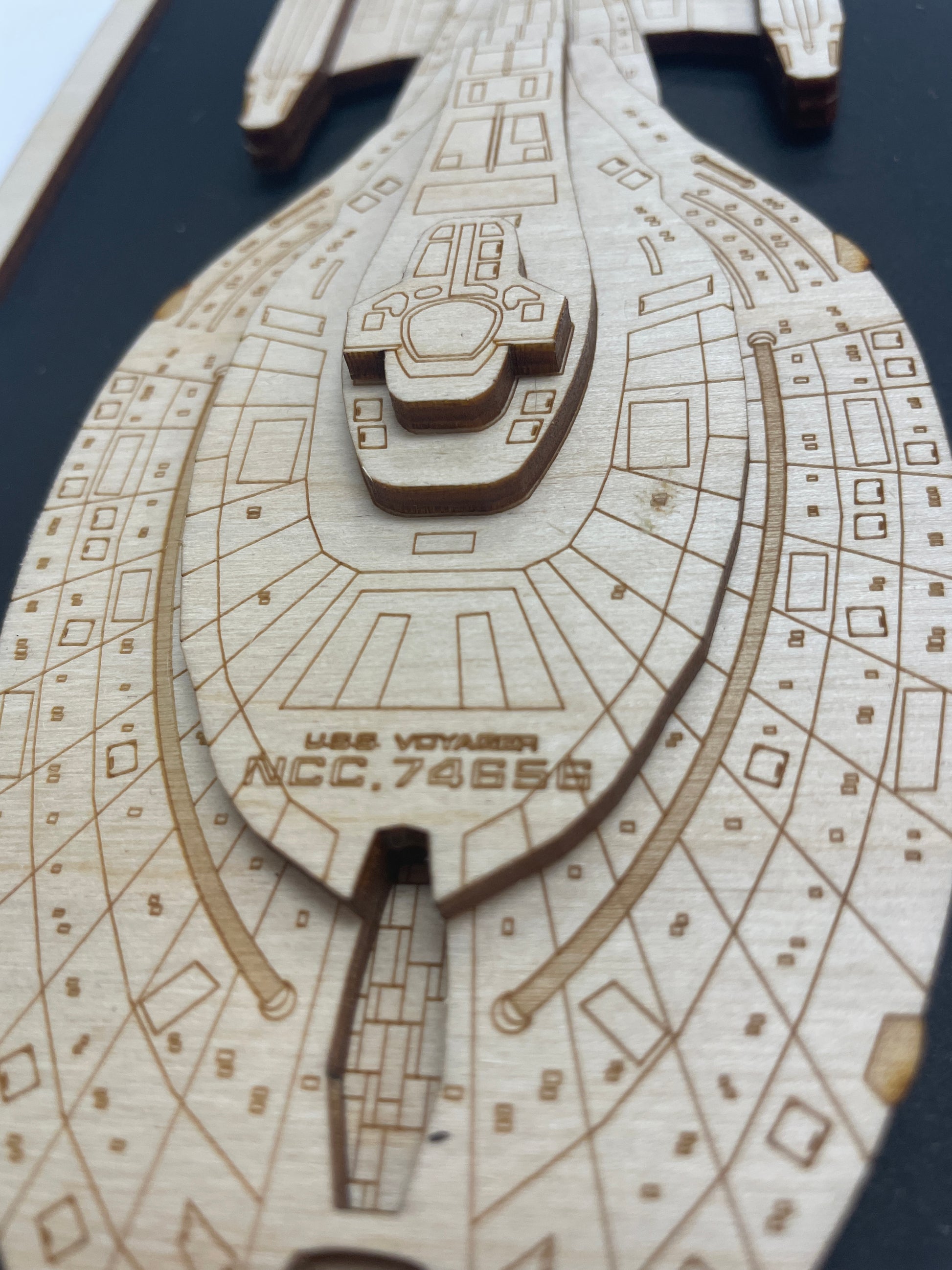 Wood pop art starship plaque of the USS VOYAGER (INTREPID CLASS). Built from layers of durable plywood giving the model a three dimensional effect. A sheet of black museum board makes the starship’s details pop. An LCARS style border frames the models. Put it on your desk, display rack or bookshelf. A great display item for that Trekkie in your life.