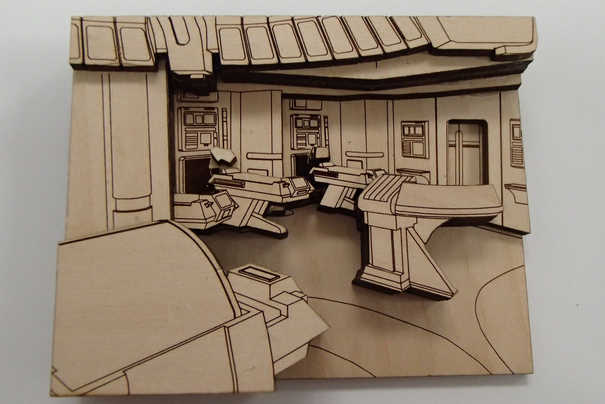 A wonderful laser cut model of VOYAGER'S SICKBAY! Please state the medical emergency? A unique piece that would stand out in any Trek display. Laser cut from durable plywood sheets and layered to produce a three dimensional effect. Each model is hand assembled by me with all the love of a lifelong Trekkie.