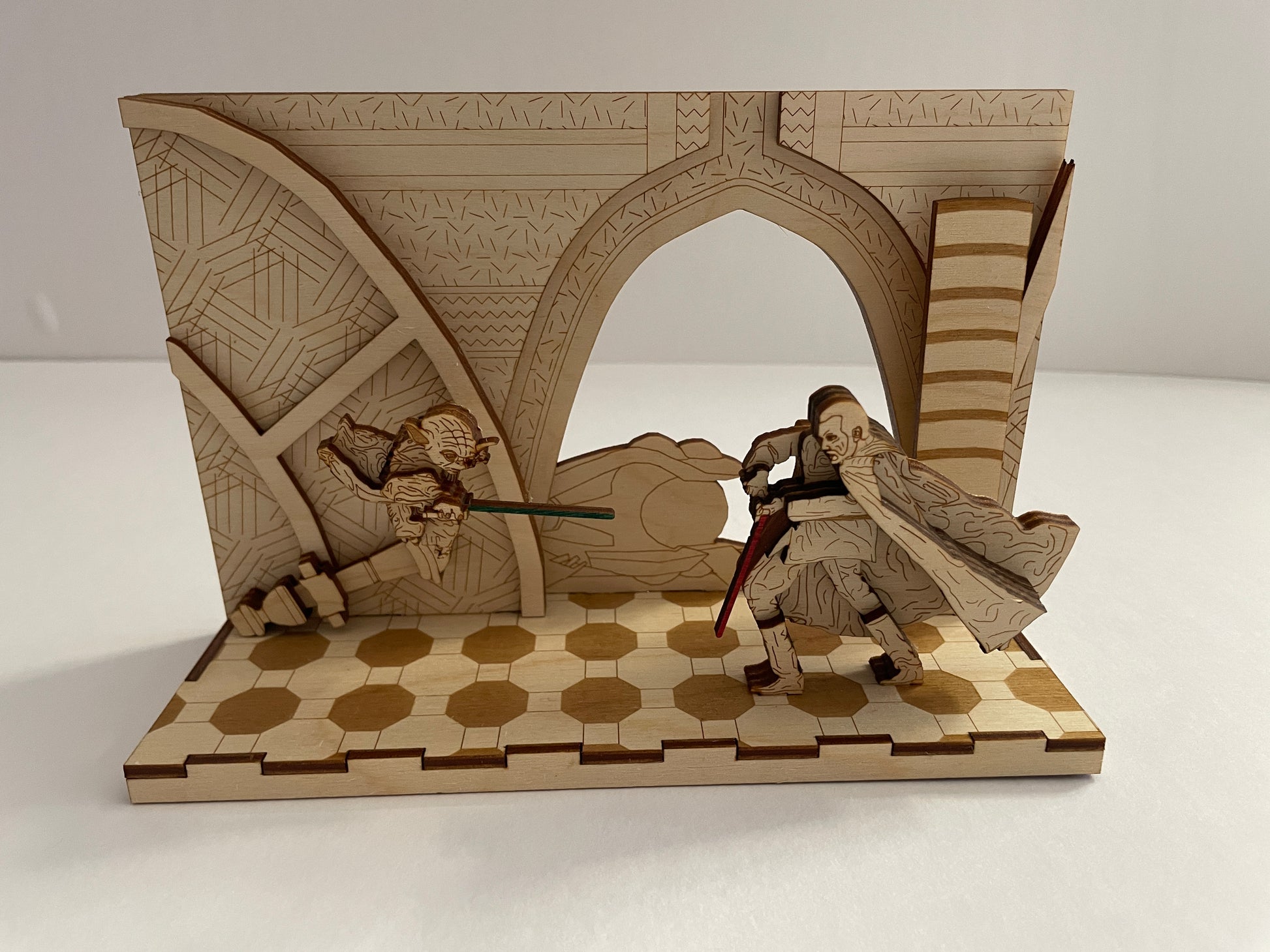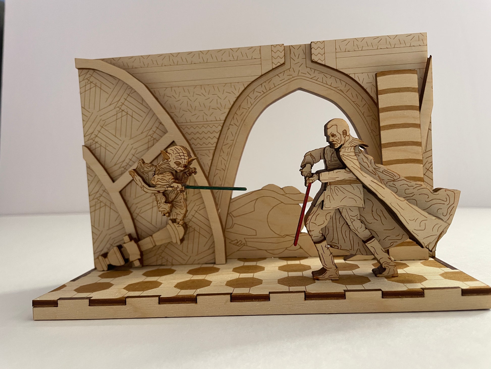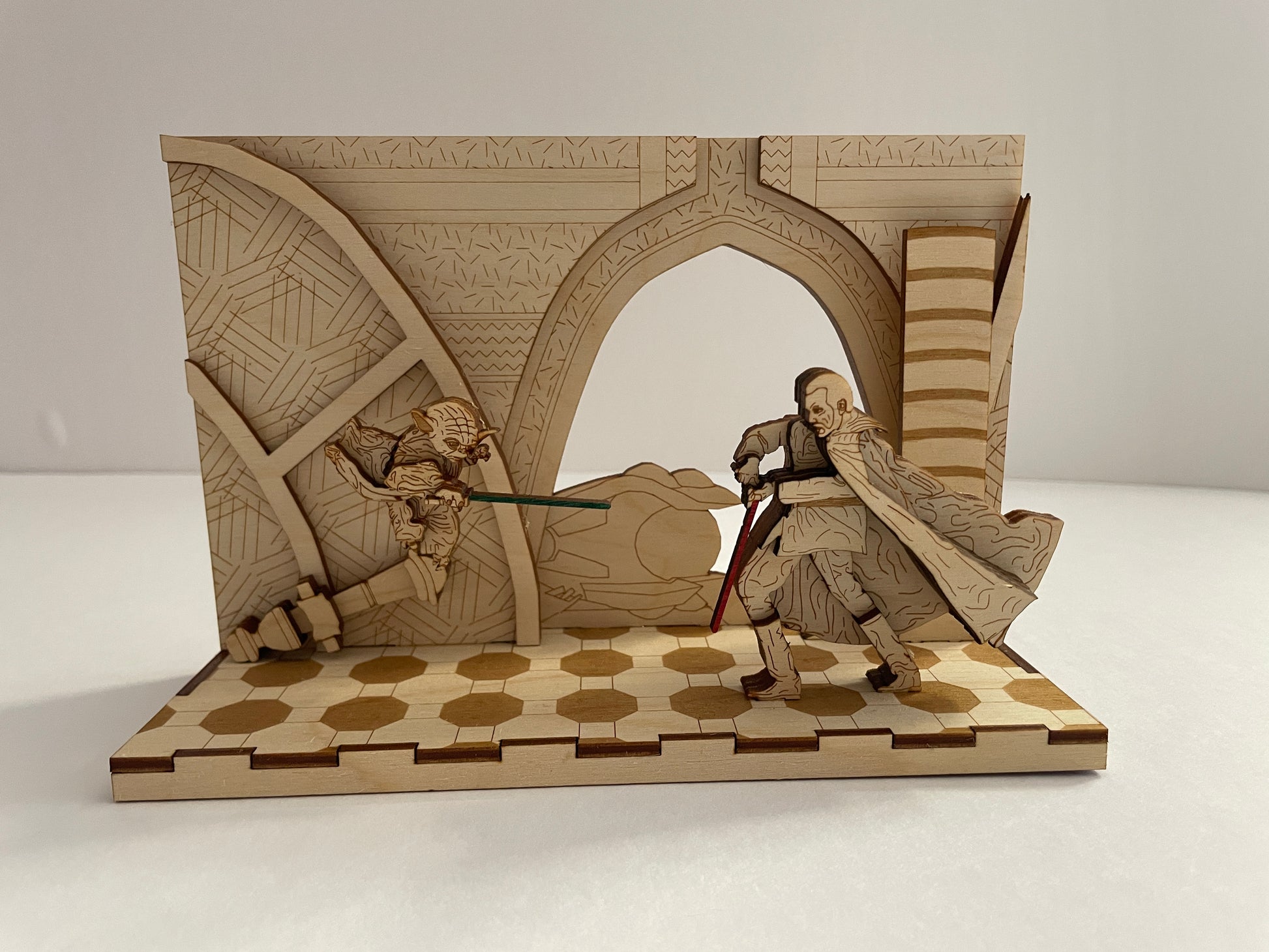 Pop art wood model of the duel between Yoda and Count Dooku. Built from durable layers of plywood to create a three dimensional effect. A perfect model for your Star Wars fan in your life. It can sit on a desk, a shelf, inside a display case. This model is a great addition to your Star Wars collection. Own this one of a kind product showing off one of the iconic scenes of the franchise.